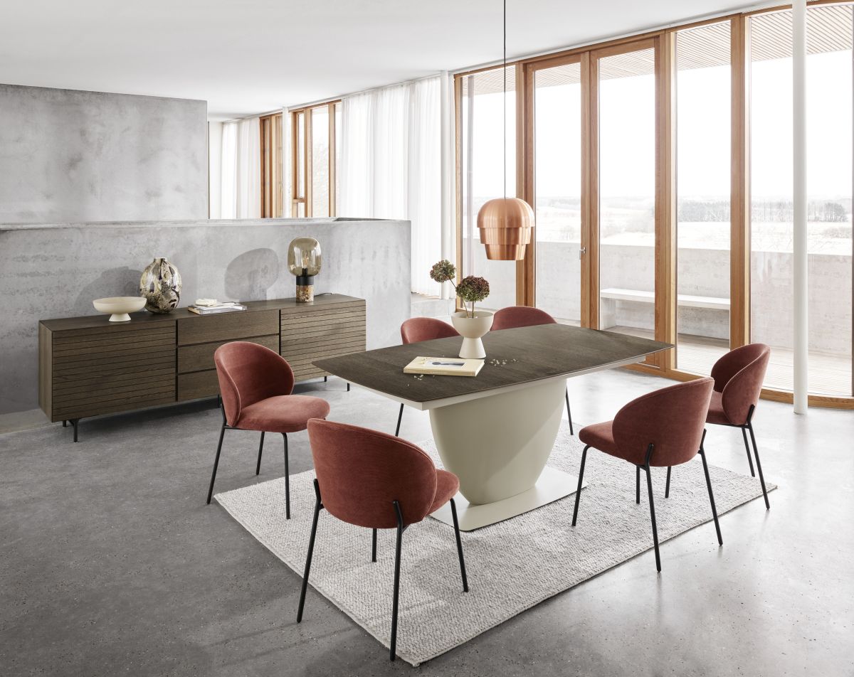 Stół Fiorentina, jako następca popularnego modelu Milano, jest dostępny w nowych kolorach i wykończeniach. Metalowe detale ramy zamieniono na wyszukane matowe czernie i biele, z kolei organiczny kształt podstawy można teraz zamówić w modnej, popielatej szarości. Jego kolorystyka może stać się punktem wyjścia do stworzenia spójnej aranżacji w jadalni przy użyciu stonowanych barw, urozmaiconej wyrazistymi dodatkami, takimi jak dywan o ciekawej teksturze czy dekoracyjny wazon.