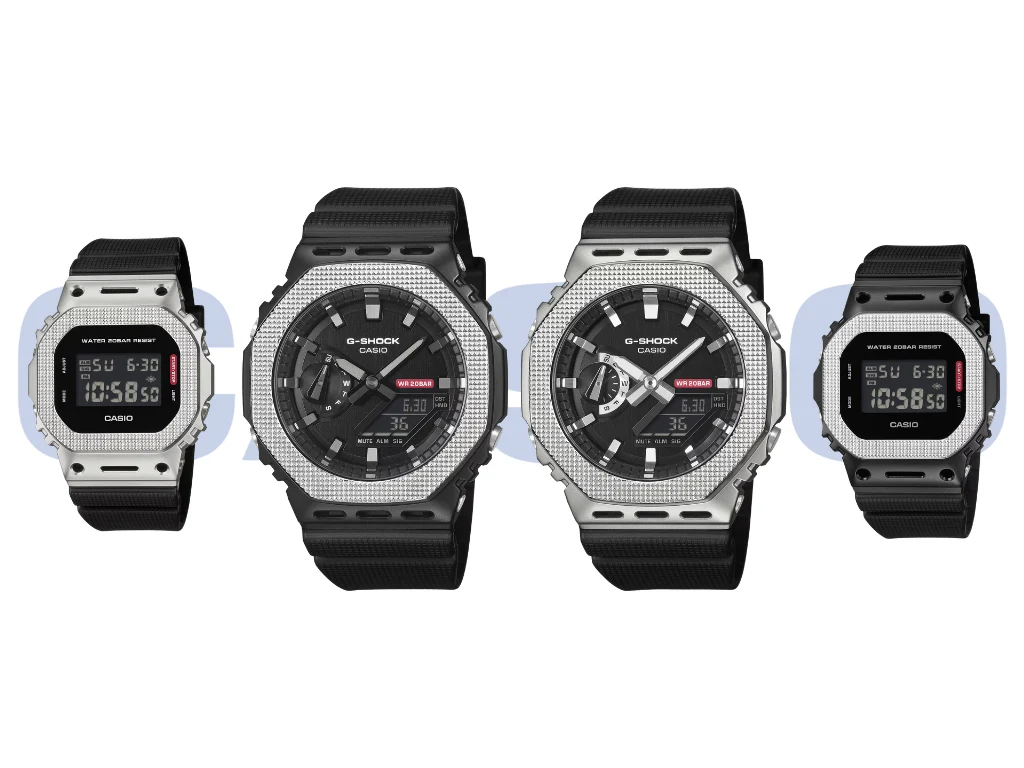 Seria Modern Industrial wyróżnia się przede wszystkim unikalnym wzorem siatki na metalowych kopertach, który nadaje zegarkom surowy, przemysłowy charakter. To wykończenie nie jest jedynie elementem dekoracyjnym – powierzchnia przypominająca wentylację klasycznego telewizora skutecznie maskuje odciski palców i drobne zarysowania. Kolekcja obejmuje modele GM-5600M-1JF oraz GM-2100M-1JF w srebrnym wykończeniu, a także wersje gunmetalowe GM-5600BM-1JF i GM-2100BM-1JF. Każdy z nich zachowuje charakterystyczne kształty koppert – kwadratową dla GM-5600 i ośmiokątną dla GM-2100, znanego również jako CasiOak.