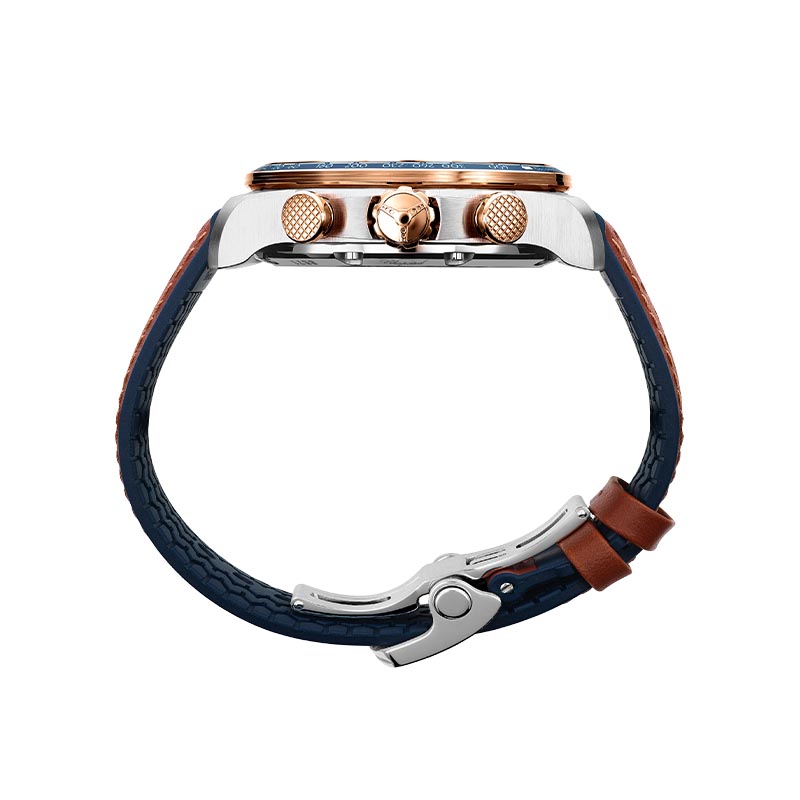 Czarny tekst na srebrnej tarczy sprawia, że wszystko jest bardzo czytelne. Duże przyciski chronografu pozostają i są łatwe w użyciu i mają koronę ozdobioną trójramienną kierownicą. Pasek ze skóry cielęcej to styl rajdowy dzięki perforacji, który idealnie nadaje się do chronografu upamiętniającego historyczny wyścig. Od wewnętrznej strony paska jest on wykończony gumą ze wzorem bieżnika opony.
