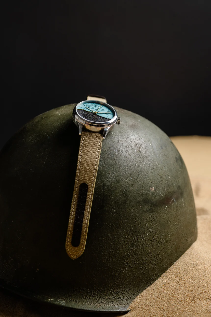 Tarcza zegarka prezentuje historyczną mapę plaży Omaha, jednego z pięciu miejsc lądowania wojsk alianckich podczas operacji Neptune w dniu 6 czerwca 1944 roku. To największa inwazja desantowa w historii, w której uczestniczyło 73 tysięcy amerykańskich żołnierzy.