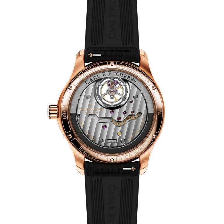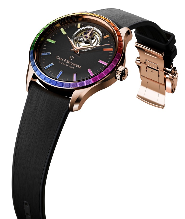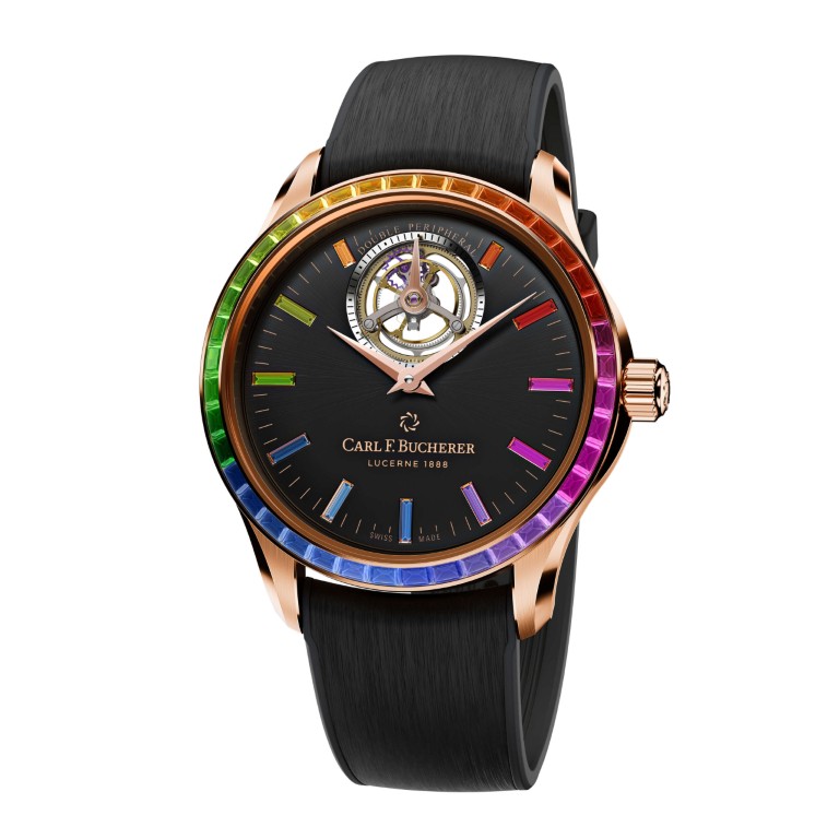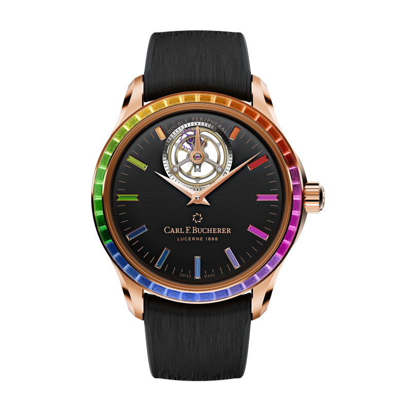 W najnowszym wydaniu Manero Tourbillon Double Peripheral ta pomysłowa tarcza tourbillon jest dodatkowo podkreślona przez połączenie lunety o pełnym spektrum zawierającej 40 kamieni szlachetnych o szlifie bagietkowym, w tym tsaworyty, szafiry i rubiny oraz indeksy z kamieni szlachetnych. Każdy kamień szlachetny został skrupulatnie wyselekcjonowany, aby zapewnić, że każdy z nich płynnie łączy się z następnym i pasuje do reszty na tarczy. Kontrastujące czarne tło słonecznej tarczy i gumowego paska jeszcze bardziej podkreśla komplikację i tęczowy design. Jako dodatkową warstwę tekstury i koloru Carl F. Bucherer wybrał kopertę i wskazówki z 18-karatowego różowego złota.