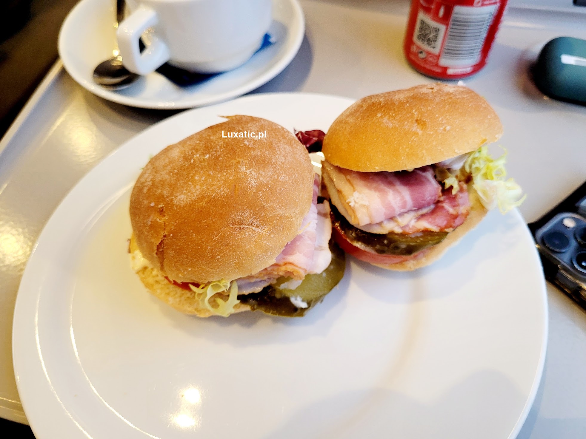 Po krótkiej chwili otrzymujemy talerz oraz dwie brioszki z boczkiem, serkiem, ogórkiem, pomidorem oraz sałatą.