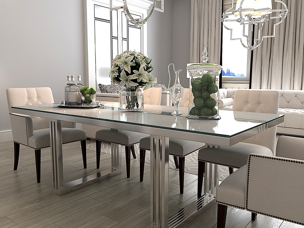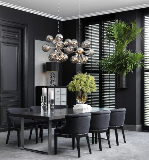 Duży, solidnie wykonany i stabilny stół to najważniejszy element jadalni. W przypadku stołu w cenie jest prostota, która pozwala na dobranie do niego finezyjnych, stylowych krzeseł. A modeli tychże w ofercie Eichholtz znajduje się aż 85. Gdy już zostaną wybrane, kolejnym ważnym elementem aranżacji jest żyrandol, który zawiśnie nad stołem. Warto pamiętać, że efektowny model świetnie zamyka kompozycję od góry i często jako pierwszy przyciąga wzrok. Nie bez znaczenia jest również światło, jakie daje. Powinno ono dobrze doświetlać stół, a jednocześnie być rozproszone i miękkie.